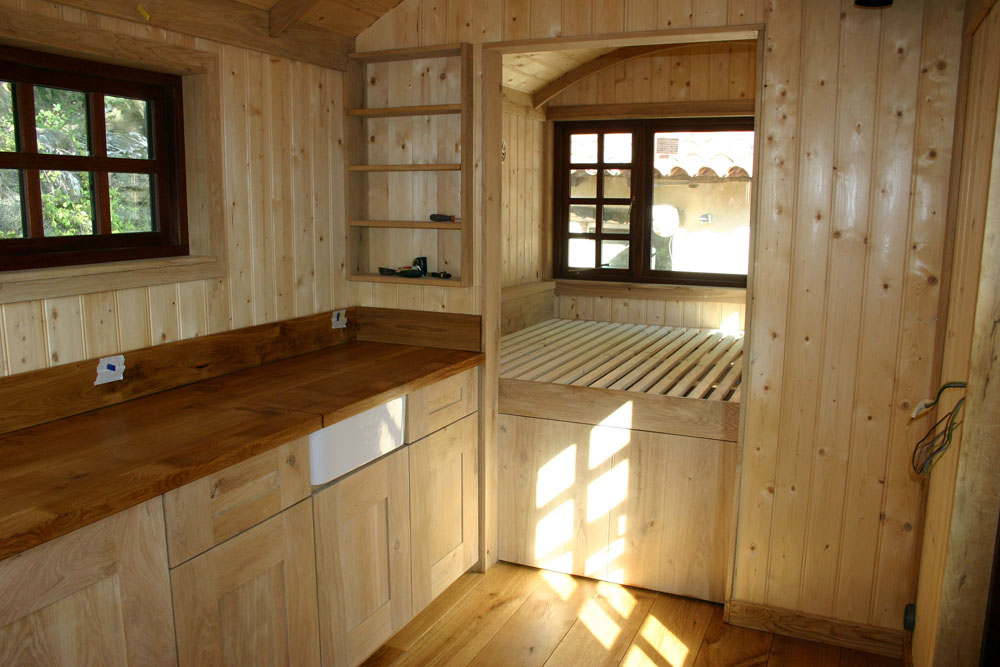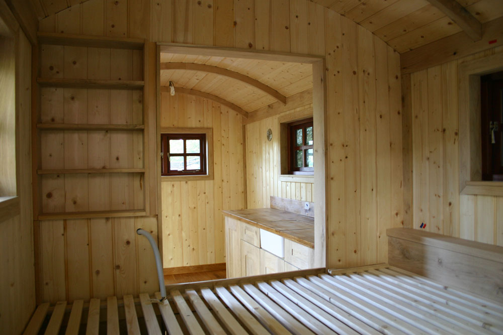 Built by Arvid, in Holland for a Danish customer living in France. All the bespoke joinery was supplied by Tithe Barn, together with the Hobbit Stove and black corrugated roof sheets. The hut is ecologically built, using ecological materials and techniques.
